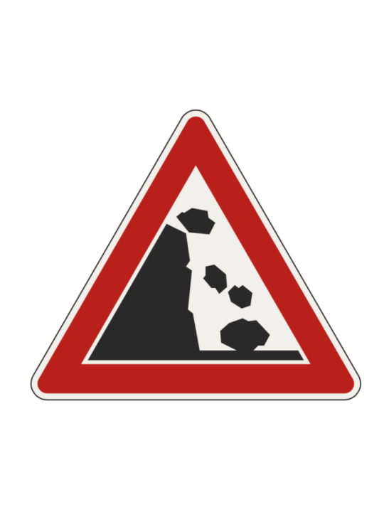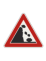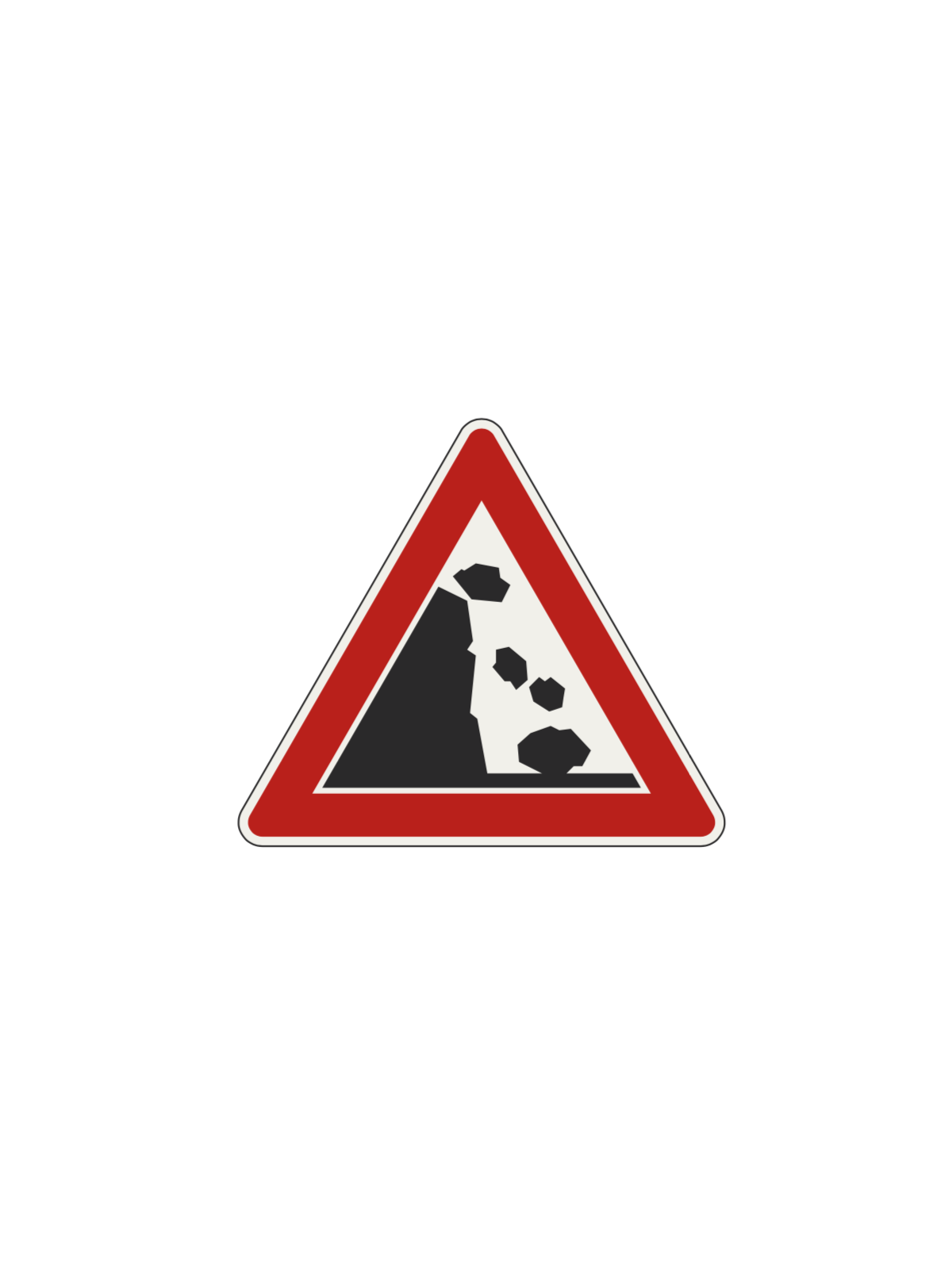 Značka upozorňuje na zvýšené riziko výskytu kameňov v dôsledku zosuvu alebo padania kameňov na vozovku.Ak je riziko prevažne na ľavej strane vozovky, symbol sa vyobrazuje zrkadlovo.
